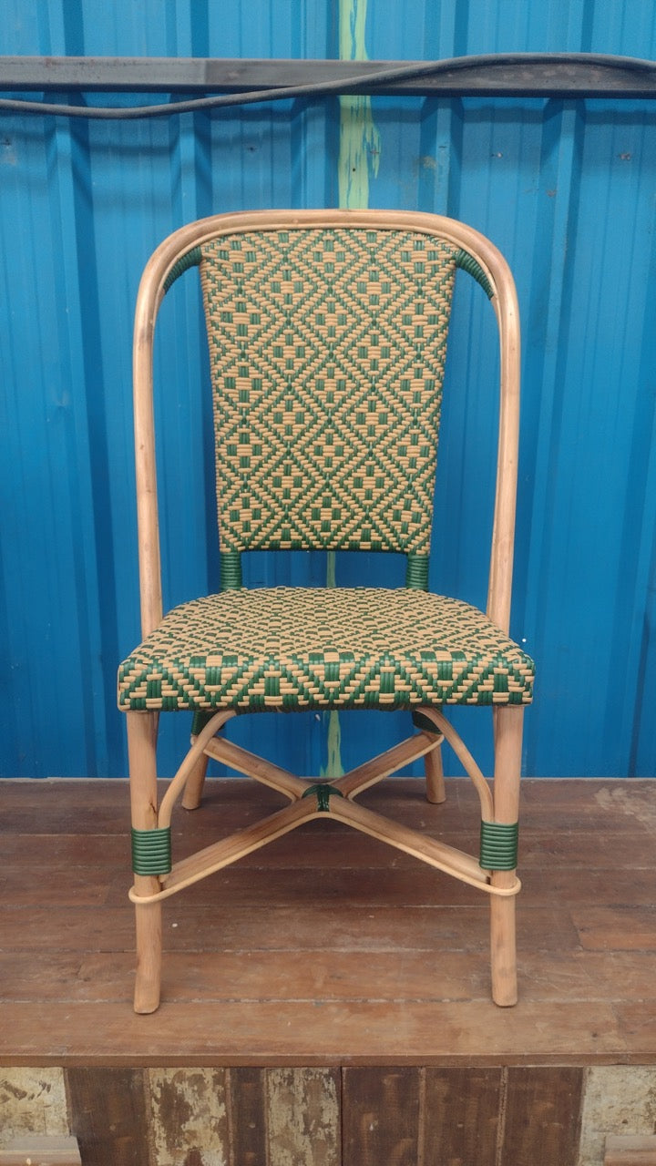 Our new woven bistro chairs will bring the Burmese summer to your house or garden. Ideal for coffee on your balcony or patio, or by a sunny window, these are woven by hand just outside Yangon. They weave pattern is inspired by the Chin tribes from northwest Burma and the soothing green colour recalls the pine trees of the Burmese hills.