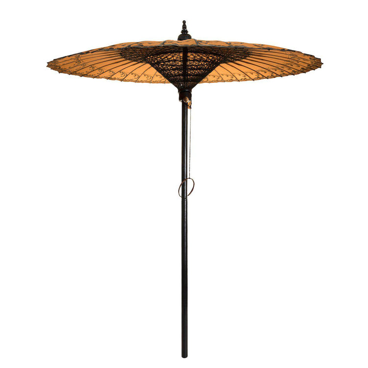 The warm colour of this Garden Umbrella will add instant Burmese brightness to your garden. Use in the centre of your outdoor table, or standing alone. The beautiful painted design is hand-painted onto cotton and stretched over a wooden and bamboo frame. The gorgeous fretwork is hand threaded in thick cotton. It's a real thing of beauty, completely handmade in South-West Burma.